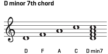 Take the chord symbols, for example. A “Dm7 chord” (“D-minor-seven”) suggests four specific pitches. Here’s what it looks like written on a music staff: